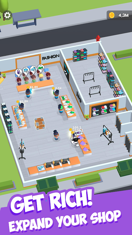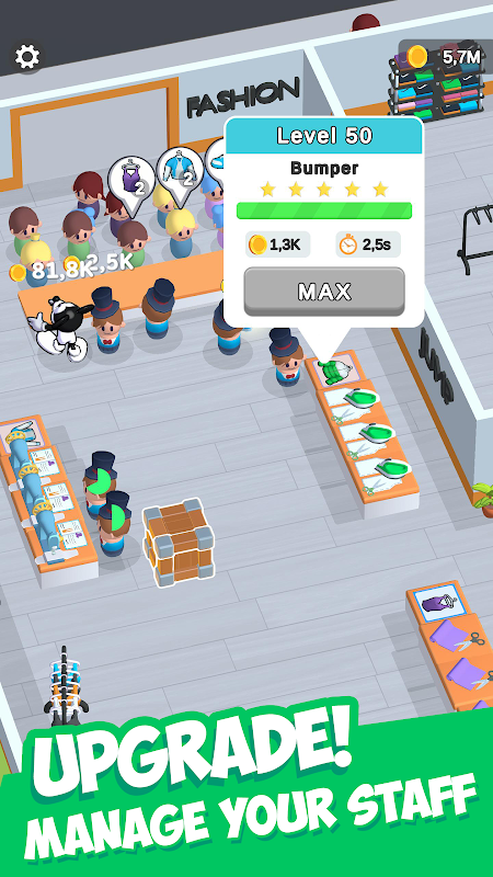 কিন্তু ইডল স্ট্রিটওয়্যার অবকাঠামোতে থামে না। প্রতিটি সফল বিক্রয়ের সাথে, আপনি আপগ্রেডগুলি আনলক করার কাছাকাছি যান যা সবচেয়ে জনপ্রিয় ফ্যাশন প্রবণতাগুলিকে পরিচয় করিয়ে দেয় এবং আরও গ্রাহকদের আকর্ষণ করে৷ আপনার ব্যবসার প্রস্ফুটিত হওয়ার সাথে সাথে আপনার দোকানকে ক্রমাগত উন্নত করা, চাহিদা বজায় রাখতে নতুন প্রোডাকশন স্টেশন এবং কর্মীদের যোগ করা অত্যন্ত গুরুত্বপূর্ণ।