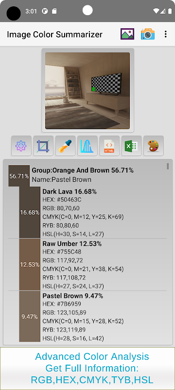 ইমেজ কালার সামারাইজার যেকোনো ছবি থেকে রং বের করে এবং আপনাকে সম্পূর্ণ পরিসংখ্যান তথ্য দেয় যেমন রঙের নাম, রঙের শতাংশ, RGB, HEX, RYB, CMYK, এবং HSL।
