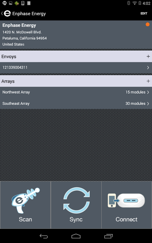 - জুড়ি অ্যারে বিন্যাস, স্ক্যান microinverter সিরিয়াল নম্বর নির্মাণ এবং আলোকপাত করা পর্যবেক্ষণ সফ্টওয়্যার সঙ্গে তথ্য (একটি সকেট মোবাইল CHS সিরিজ অ্যাপল সার্টিফাইড ব্লুটুথ স্ক্যানার প্রয়োজন) সিঙ্ক করার জন্য একটি ব্লুটুথ সক্রিয় স্ক্যানার সাথে Enphase ইনস্টলার টুলকিট.