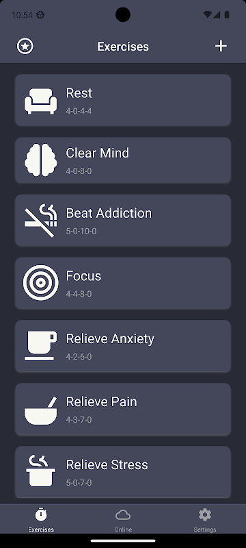 প্রতিটি ব্যায়াম একটি টাইমার যা চারটি ধাপ অন্তর্ভুক্ত করে: শ্বাস নেওয়া (শ্বাস নেওয়া), ধরে রাখা, শ্বাস ছাড়ুন (শ্বাস ছাড়ুন) এবং পরবর্তী চক্রের জন্য অপেক্ষা করুন। নিম্নলিখিত ব্যায়াম অন্তর্ভুক্ত করা হয়: