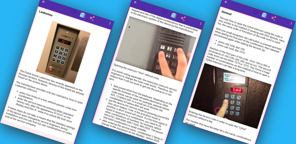 "ইন্টারকম কোড" অ্যাপ্লিকেশনের মাধ্যমে, ব্যবহারকারীরা সহজেই ইন্টারকম খুলতে প্রয়োজনীয় কোড খুঁজে পেতে পারেন। অ্যাপ্লিকেশনটি ইন্টারকমের জন্য সমস্ত কোড সরবরাহ করে যা বিল্ডিং অ্যাক্সেস করতে ব্যবহার করা যেতে পারে।