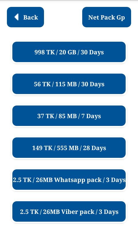”Internet pack gp -ইন্টারনেট প্যাক জিপি” আমাদের এ এ্যাপস টিতে জিপি সিমের সকল নতুন আপডেট বিভিন্ন ইন্টারনেট প্যাকেজ এর তথ্য দিয়ে সাজানো হয়ছে। আপনাদের আর কষ্ট করে দোকানদার দের বলতে হবে না শুধু মাত্র আমাদের এ এ্যাপস আপনার মোবাইল এ থাকলে আপনি নিজে নিজেই বিভিন্ন ইন্টারনেট প্যাকেজ নিতে পারবেন অতি সহজেই । যেভাবে ইন্টারনেট নিবেন , প্র্রথমে কোন প্যাকেজ টি নিবেন তা দেখুন, এবং সে প্যাকেজ টির activation code Dial এর উপর চেপে ধরে কোডটি সিলেট করে তা Copy করে ,আপনার মোবাইলের Keypad এ তা Paste করুন । তাহলে নির্দিষ্ট পরিমান ইন্টারনেট প্যাকেজ টি পেয়ে যাবেন । এছাড়া আপনাদের মেসেজে বিভিন্ন সময় যে অফার গুলো দেয় সে গুলো শুধু কিছু সময়ের জন্য ।