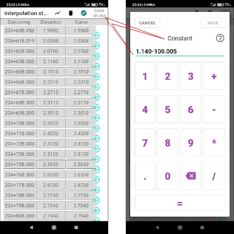 • সমস্ত মানগুলিতে একটি নির্বিচারে ধ্রুবক যোগ করার জন্য এটি অ্যাপ্লিকেশনটিতে উপলব্ধ - এটি আপনাকে স্তরের জন্য উচ্চতা অবিলম্বে গণনা করতে দেয়। লেভেল স্টাফের উচ্চতা গণনা করা হবে, অর্থাৎ ডিজাইন মার্ক (100.005) লেভেল স্টাফদের 1.140 মিটারের উচ্চতায় ধ্রুবক (-98.865) প্রবেশ করে পুনরায় গণনা করা হবে।