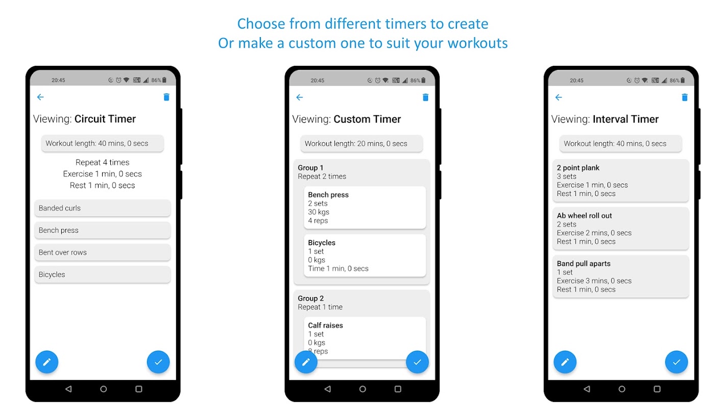 - যেকোনো তীব্রতার ওয়ার্কআউট তৈরি করতে আপনার নিজস্ব লেবেল এবং সময়গুলির পাশাপাশি সময়-ভিত্তিক এবং প্রতিনিধি-ভিত্তিক ব্যায়ামগুলির সাথে একটি সম্পূর্ণ কাস্টমাইজযোগ্য টাইমার তৈরি করুন এবং ব্যবহার করুন