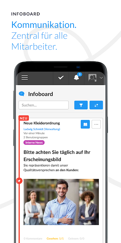 ডিজিটালি সংগঠিত যোগাযোগ এবং শাখা পরিচালনার সমাধান ইন্ট্রাটল to একটি সংস্থা হিসাবে, আপনি কর্মীদের কেন্দ্রীয়ভাবে সংবাদ সম্পর্কে অবহিত করেন। কার্য, ফর্ম এবং চেকলিস্ট সহ আপনার সংস্থাকে নিয়ন্ত্রণ করুন। অফিস, উত্পাদন, বিক্রয়, রসদ বা হোম অফিস থেকে - ইন্ট্রাটোলের সাথে আপনি সর্বদা আপনার কর্মীদের সাথে যোগাযোগ রাখেন।