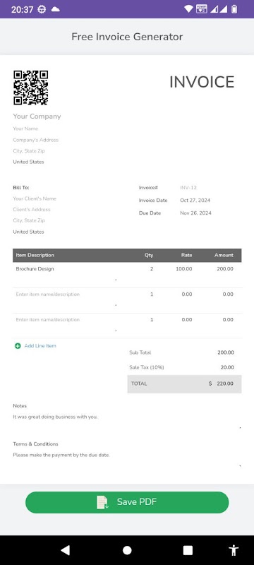 আমাদের ফ্রি ইনভয়েস জেনারেটর হল একটি সহজে ব্যবহারযোগ্য অনলাইন টুল যা ফ্রিল্যান্সার, ছোট ব্যবসার মালিক এবং উদ্যোক্তাদের দ্রুত পেশাদার চালান তৈরি করতে সাহায্য করার জন্য ডিজাইন করা হয়েছে। এটি কাস্টমাইজযোগ্য টেমপ্লেট অফার করে যেখানে আপনি কোম্পানির লোগো, ক্লায়েন্টের তথ্য, পণ্য বা পরিষেবার আইটেমাইজড তালিকা, অর্থপ্রদানের শর্তাবলী, করের হার এবং ডিসকাউন্টের মতো প্রয়োজনীয় বিবরণ যোগ করতে পারেন। স্বয়ংক্রিয় গণনা, ডাউনলোডযোগ্য PDF বিকল্পের মতো বৈশিষ্ট্য সহ, এই টুলটি সময় বাঁচায় এবং সঠিক চালান নিশ্চিত করে। ব্যবহারকারীদের জন্য আদর্শ যারা বিলিং পরিচালনার জন্য একটি সহজ, অ্যাক্সেসযোগ্য সমাধান চান এবং তাদের ব্যবসায়িক লেনদেনের জন্য একটি পালিশ, পেশাদার চেহারা বজায় রাখতে চান।