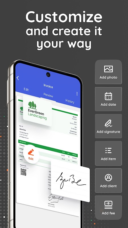 ঘটনাস্থলেই পেশাদার-সুদর্শন ইনভয়েস এবং অনুমান তৈরি করতে ইনভয়েস জেনারেটর ব্যবহার করা সহজ।