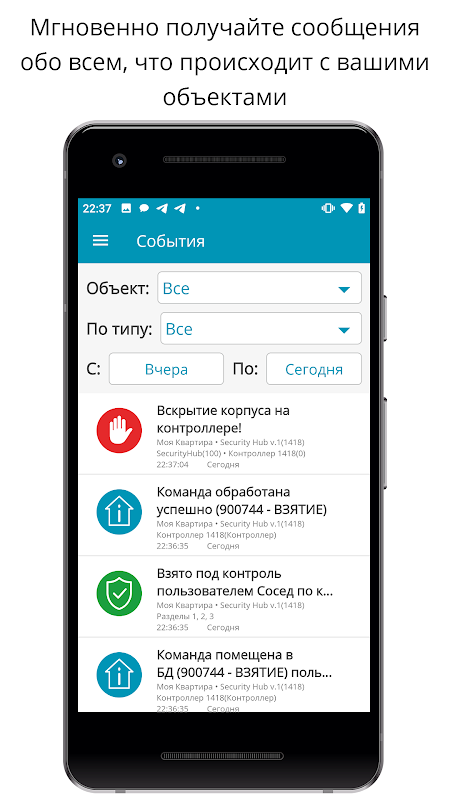 - уведомления обо всех аварийно-тревожных ситуациях, в том числе вторжении, возгорании/задымлении, протечки воды, превышении заданного порога по температуре, потери связи с датчиком и т.д.