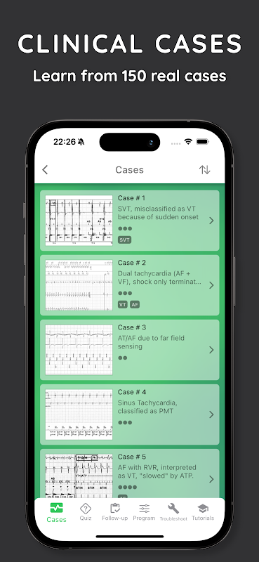 কার্ডিয়াক অ্যারিথমিয়াস এবং কার্ডিয়াক ডিভাইসের জীবন রক্ষাকারী প্রভাব সম্পর্কে জানতে সমস্ত সম্পর্কিত ডকুমেন্টেশন (প্রোগ্রামার স্ট্রিপ, ইসিজি, এক্স-রে, ইত্যাদি) সহ সম্পূর্ণ বাস্তব ক্লিনিকাল কেসগুলিতে ডুব দিন।