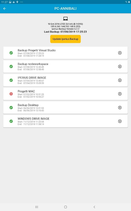 একক এবং কেন্দ্রীয় ড্যাশবোর্ডে আপনি সমস্ত সার্ভার এবং ওয়ার্কস্টেশনগুলি দেখতে পাবেন যেখানে ইপারিয়াস ইনস্টল করা আছে, ব্যাকআপ কাজগুলি নিয়ন্ত্রণ করুন এবং তাদের ফলাফলগুলি দেখুন। আপনি ব্যাকআপ তারিখ এবং সময়, Iperius সংস্করণ, তথ্য পরিমাণ, কপি করা ফাইল এবং সম্ভাব্য ত্রুটি সংখ্যা দেখতে পারেন।