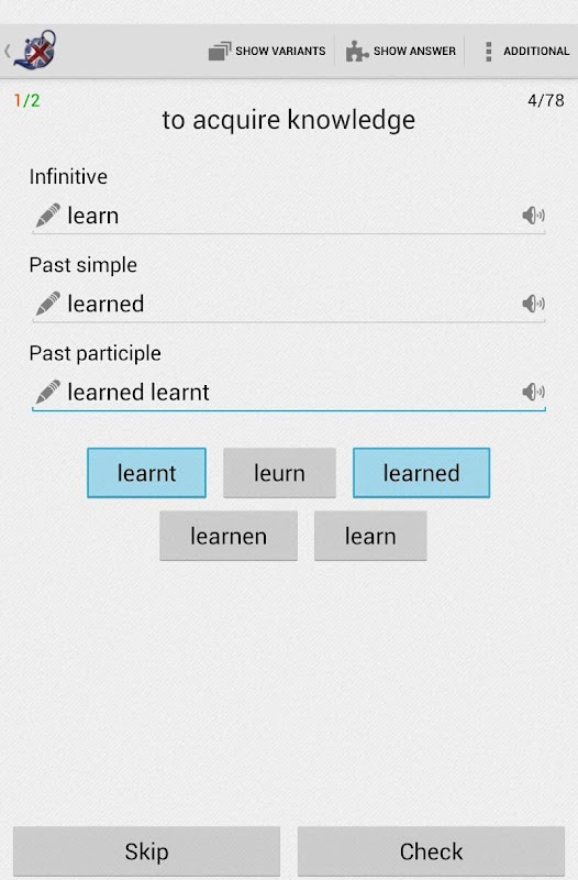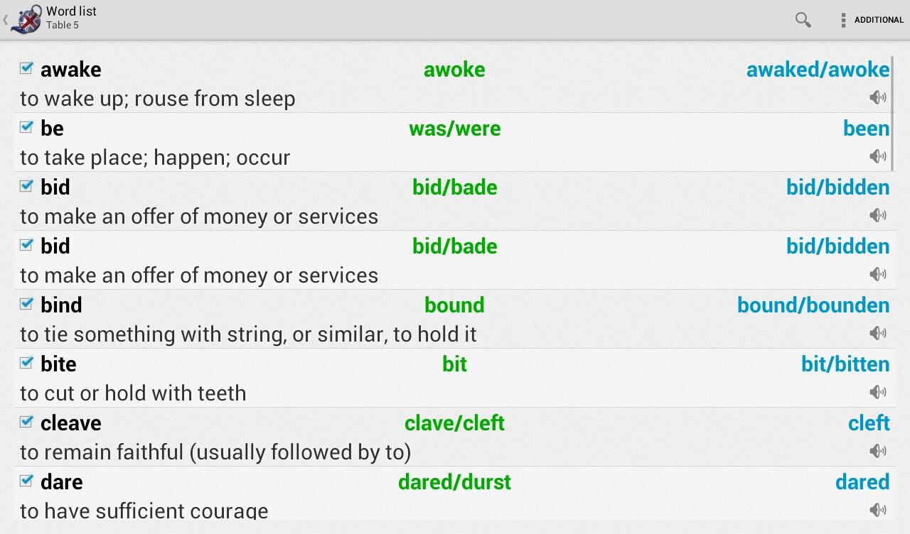 ইংরেজিতে অনিয়মিত ক্রিয়া জানুন. একই শব্দ একসঙ্গে দলবদ্ধ করা হয়. এই কমান্ডের সাহায্যে আপনি খুব সহজে তাদেরকে মুখস্থ করতে সাহায্য করে. আপনি উত্তর টাইপ অথবা একটি মাল্টিপল চয়েস তালিকা থেকে নির্বাচন করে নিজেকে পরীক্ষা করতে পারবেন. সকল ক্রিয়া শব্দ এবং একটি ফনেটিক ট্রান্সক্রিপশন সঙ্গে আসা.