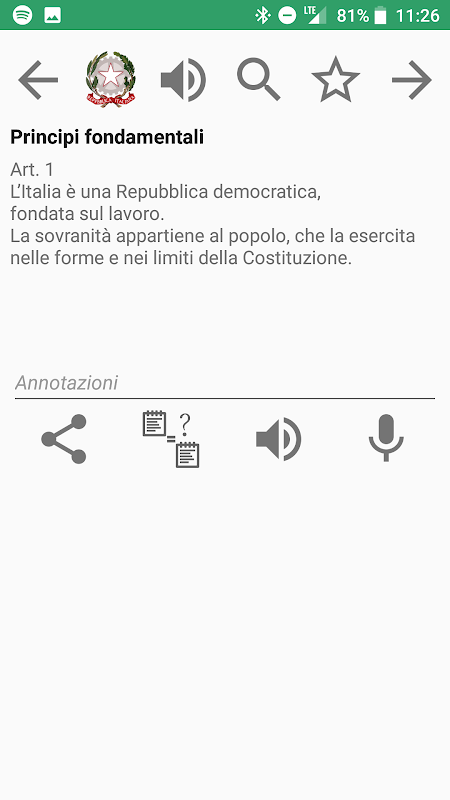 আরামদায়ক এবং বোধগম্য বিন্যাস থেকে এই অ্যাপ্লিকেশানটির আপনি বলবত্ সংবিধান বা মূল ইতালীয় সব নিবন্ধ ব্রাউজ করতে পারেন।