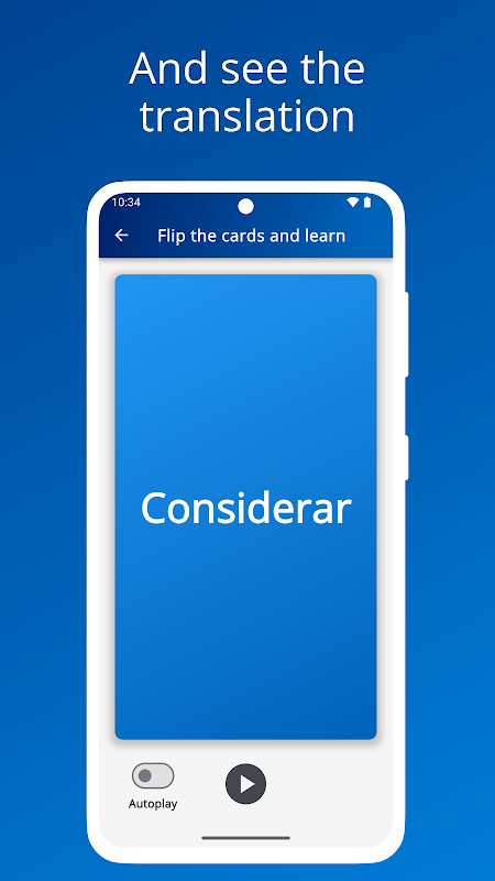 • Flashcards: একটি শব্দ দেখুন এবং অনুবাদ মুখস্থ করুন। অন্তর্নির্মিত অডিও ফাংশন সহ উচ্চারণ শুনুন।