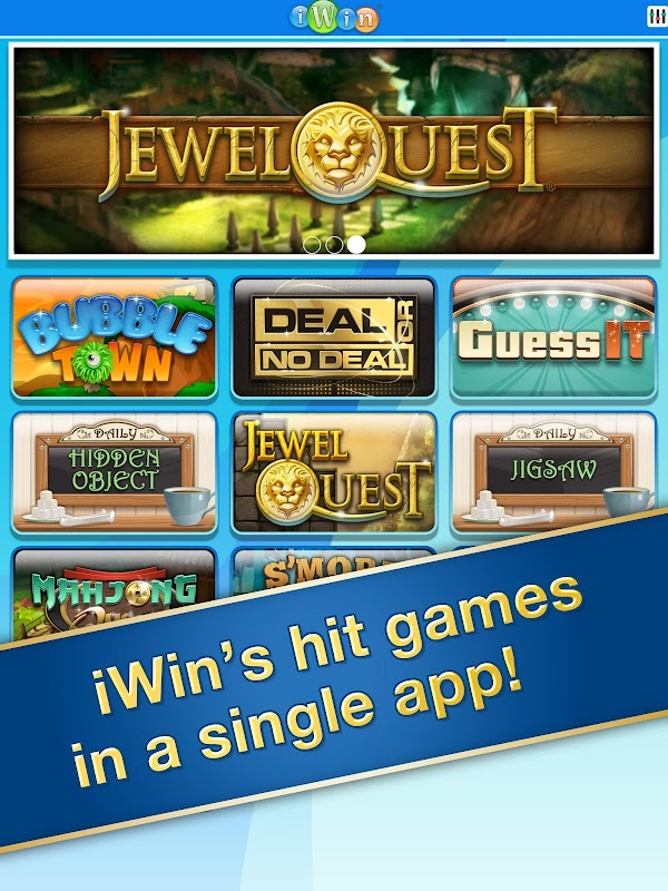 Now you can play iWin's most popular free games right from your Android smartphone or tablet with the official iWin app! This app offers many of iWin’s top games including Jewel Quest, Deal or No Deal, Bubble Town, Mahjong Quest and many more. Best of all, these games are absolutely free! That is right, no in-app purchases or limited trials! Play to your heart’s content anytime, anywhere.
