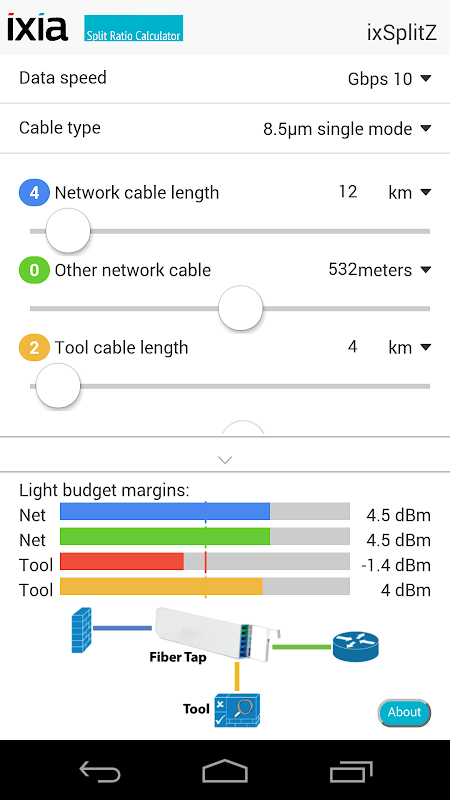 আপনার লিংক গতি এবং তারের প্রকার নির্বাচন করুন, এবং উপরের তিনটি স্লাইডার ব্যবহার করুন আপনার ক্যাবল দৈর্ঘ্য প্রবেশ করতে। বাম দিকে ব্যাজগুলি একটি ডায়ালগ পপ আপ করে যা আপনি প্রতিটি ক্যাবলের অতিরিক্ত স্প্লাইসেসের সংখ্যা (যেমন, প্যাচ প্যানেল, প্রতিটি মিলিত সংযোগকারী জোড়ার জন্য +1 যোগ) লিখতে ব্যবহার করতে পারেন। প্রতিটি আলাদা মাল্টিমিডের জন্য -0.5 ডিবিএম, একক মোডের জন্য -0.2 ডিবিএম। (এন্ডপয়েন্ট সংযোগগুলি ইতোমধ্যেই ইতিবাচক হয়ে গেছে, তাই ব্যাজটি 0 পড়তে হবে যদি তারপরে সরাসরি এক্সপ্রেস পয়েন্ট সংযুক্ত করা হয়।) ট্যাপের বিভাজক অনুপাত পরিবর্তন করতে চারটি স্লাইডার ব্যবহার করুন এবং এটি চার প্রান্তিক বিন্দুতে হালকা বাজেটের মার্জিনকে প্রভাবিত করে দেখায়।