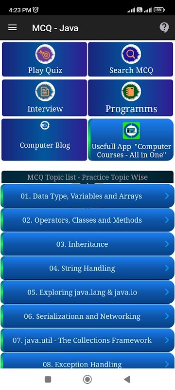"জাভা প্রোগ্রামিং: MCQ, জাভা কুইজ, জাভা ইন্টারভিউ, সমস্ত জাভা প্রোগ্রাম" এর সাথে, জাভা প্রোগ্রামিং আয়ত্ত করতে এবং আপনার দক্ষতাকে পরবর্তী স্তরে নিয়ে যাওয়ার জন্য আপনার যা দরকার তা আপনার কাছে থাকবে। তাহলে কেন অপেক্ষা করবেন? আজই আমাদের অ্যাপটি ডাউনলোড করুন এবং আপনার জাভা দক্ষতা উন্নত করা শুরু করুন!