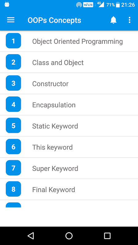 এই অ্যাপসটি সম্পূর্ণরূপে অফ-লাইনের সাথে কাজ করছে। এই অ্যাপ্লিকেশনটি থেকে "জাভা ওওপিএস ধারণাগুলি" বেসিক এবং উন্নত ধারণাগুলির সহজ উপায়।