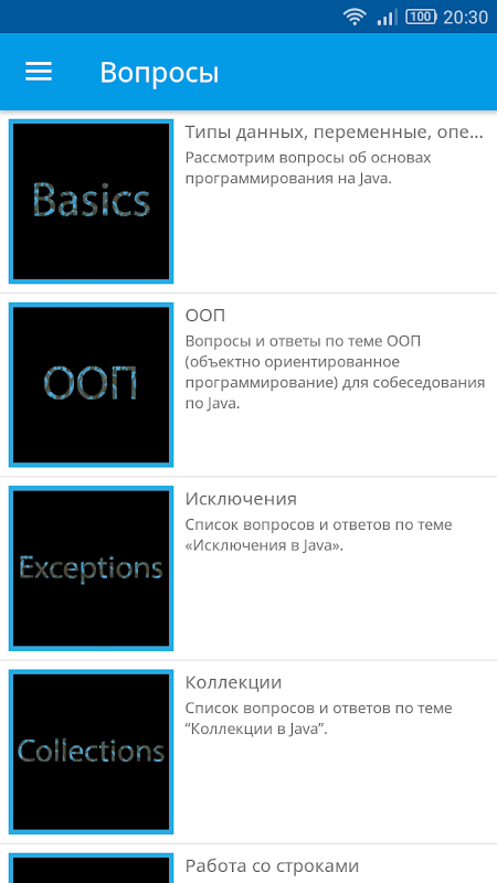 Also application contains standard (and not) questions, which are usually can be heard at Java interview.