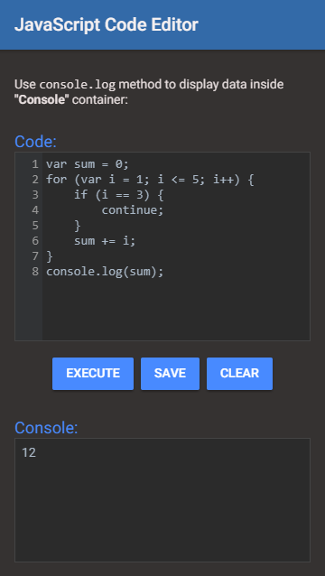 JavaScript Code Editor supports console.log, console.warn, console.debug, console.info and console.error. You can use them to display the result of the written JavaScript code inside console container.