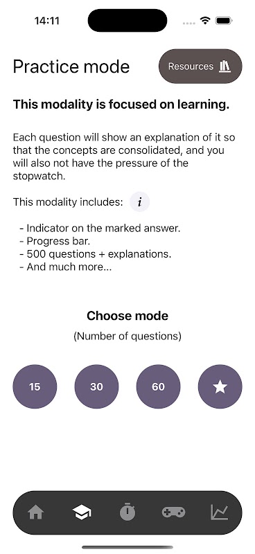 - পরীক্ষার মোড, অফিসিয়াল পরীক্ষার একটি বাস্তব সিমুলেশন: 40 মিনিটে 30টি প্রশ্ন।