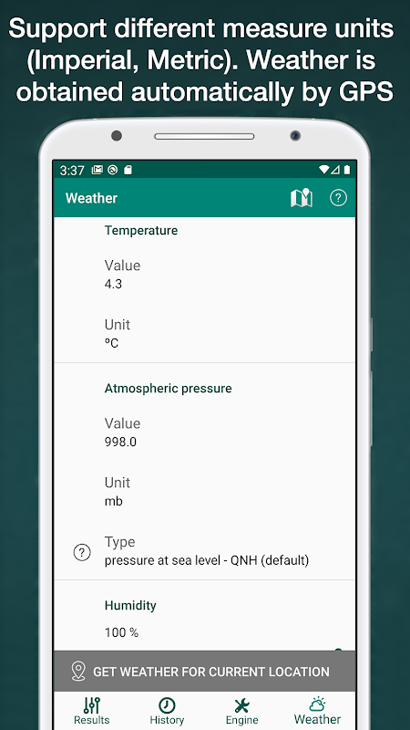 • আবহাওয়া: এই ট্যাবে, আপনি বর্তমান তাপমাত্রা, চাপ, উচ্চতা এবং আর্দ্রতার মান সেট করতে পারেন। এছাড়াও এই ট্যাবটি বর্তমান অবস্থান এবং উচ্চতা পেতে জিপিএস ব্যবহার করতে এবং নিকটতম আবহাওয়া স্টেশনের আবহাওয়ার অবস্থা (তাপমাত্রা, চাপ এবং আর্দ্রতা) পেতে একটি বাহ্যিক পরিষেবার সাথে সংযোগ করতে দেয় (আপনি সম্ভাব্য কয়েকটি থেকে একটি আবহাওয়ার ডেটা উত্স চয়ন করতে পারেন) ) এছাড়াও, এই অ্যাপ্লিকেশনটি আইফোনে তৈরি একটি চাপ সেন্সরের সাথে কাজ করতে পারে। আপনি এটি আপনার ডিভাইসে উপলব্ধ কিনা তা দেখতে পারেন এবং এটি চালু বা বন্ধ করতে পারেন। এছাড়াও, এই ট্যাবে, আপনি সম্ভাব্য কার্বুরেটর আইসিং সম্পর্কে সতর্কতা সক্ষম করতে পারেন।