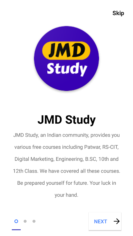 "জেএমডি স্টাডি" একটি অনলাইন শিক্ষা এবং ক্যারিয়ার পোর্টাল। এটি প্রতিযোগী এবং চাকরিপ্রার্থীদের জন্য একটি সেরা প্ল্যাটফর্ম। "জেএমডি স্টাডি" এর মূল লক্ষ্য হল পাটোয়ার, আরএস-সিআইটি, ডিজিটাল মার্কেটিং, ইঞ্জিনিয়ারিং, বিএসসি, 10 তম এবং 12 তম শ্রেণির মতো বিভিন্ন কোর্সের জন্য একটি সাধারণ প্ল্যাটফর্ম প্রদান করা যাতে শিক্ষার্থীরা এই প্রতিযোগিতামূলক পরীক্ষার জন্য সহজে প্রস্তুত হয়।