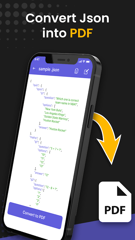 ♻️ 4. JSON থেকে পিডিএফ কনভার্টার - JSON রিডার অ্যাপ ব্যবহার করে ব্যবহারকারীরা তাদের JSON ফাইলগুলিকে PDF তে রূপান্তর করতে এবং যে কারো সাথে সহজেই শেয়ার করতে পারেন। সমস্ত রূপান্তরিত PDF ফাইলগুলি jansson বা JSON ভিউয়ার URL-এর রূপান্তরিত ফাইল ট্যাবে পাওয়া যায়৷