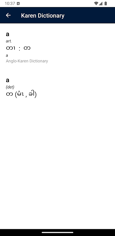কারেন ডিকশনারী অ্যাপ হল ইংরেজি এবং কারেন এর মধ্যে নির্বিঘ্ন অনুবাদের জন্য একটি নির্ভরযোগ্য টুল, যা ভাষাশিক্ষক, ভ্রমণকারীদের এবং স্থানীয় ভাষাভাষীদের চাহিদা মেটাতে ডিজাইন করা হয়েছে। এটি একটি সহজ এবং স্বজ্ঞাত ইন্টারফেসের মাধ্যমে সঠিক অনুবাদগুলি প্রদান করে, যেমন দ্রুত ইংরেজি থেকে কারেন এবং কারেন থেকে ইংরেজি অনুবাদ, যেকোনো সময় ব্যবহারের জন্য অফলাইন অ্যাক্সেস এবং দ্রুত ফলাফলের জন্য তাত্ক্ষণিক অনুসন্ধান কার্যকারিতা প্রদান করে। অন্যান্য অ্যাপে ব্যবহারের জন্য সহজেই অনুদিত পাঠ্য অনুলিপি করার ক্ষমতা সহ, অ্যাপটি তাদের শব্দভাণ্ডার প্রসারিত করতে চাওয়া ভাষাশিক্ষকদের জন্য আদর্শ, কারেন-ভাষী অঞ্চলে নেভিগেট করা ভ্রমণকারীরা এবং ইংরেজি এবং কারেন ভাষাভাষীদের মধ্যে ব্যবধান পূরণকারী যোগাযোগকারীদের জন্য।