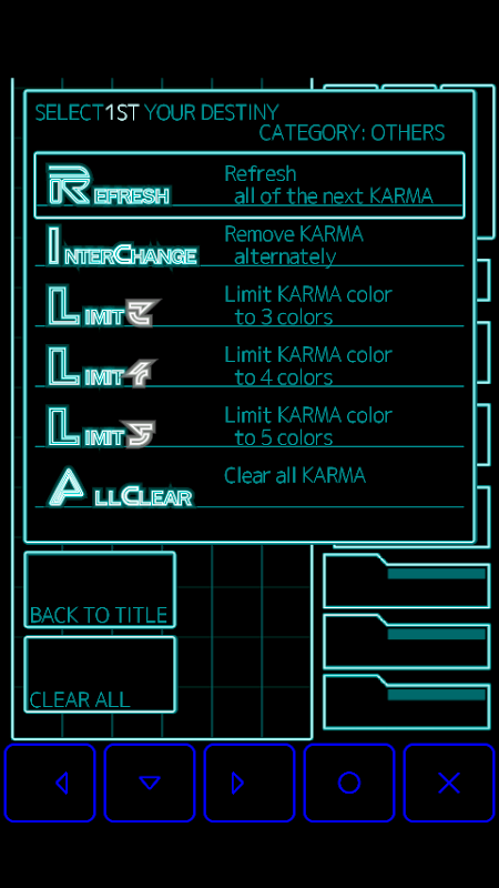 "নিয়তি" সাফ ধরনের একযোগে কর্মফল বরখাস্ত করা হয়. যথাক্রমে, উপর থেকে 2 সারি এবং 4 সারি এবং 6 সারি এবং 8 সারি মুছে ফেলুন Clear2,4,6,8. এমনকি একটি বড় সংকটে দুই লাইন disappears যদি বড় বিপরীত সেখানে থেকে একটি চেইন তৈরি করা সম্ভব করে তোলে.