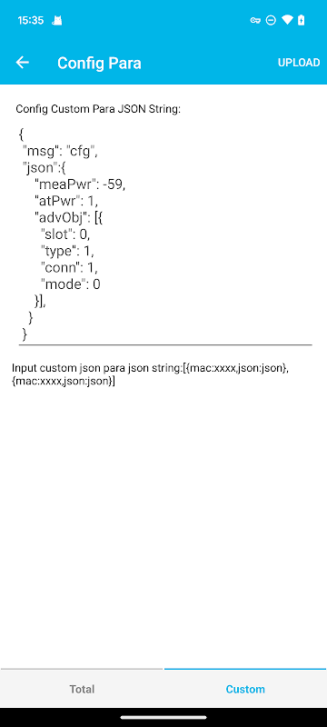 কনফিগার করা পরামিতিগুলির জন্য, যেমন সমস্ত বীকনের ট্রান্সমিট পাওয়ার 4dBm এ সেট করা, আপনি সেগুলি অ্যাপের UI এর মাধ্যমে সেট করতে পারেন বা JSON কনফিগারেশন স্ক্রিপ্ট ম্যানুয়ালি সম্পাদনা করতে পারেন৷