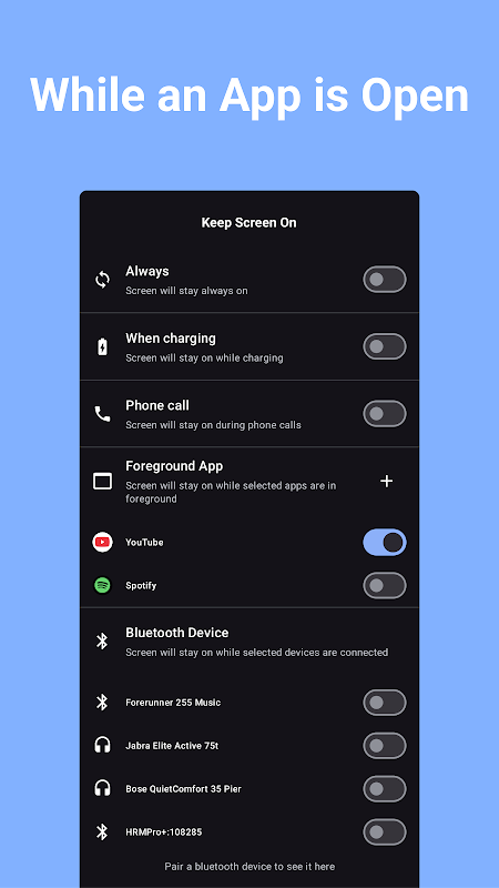 - 📱 নির্দিষ্ট অ্যাপ ফোরগ্রাউন্ডে থাকা সময় স্ক্রিন অন: কোন অ্যাপ খুললে স্ক্রিন সচল থাকবে তা নির্বাচন করুন।