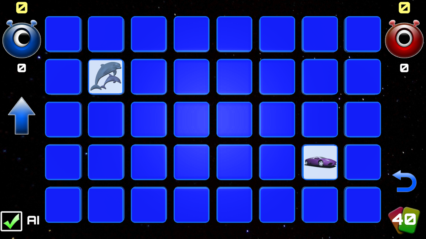 Cards will be randomized and scattered facing down. Players will take turns, on each turn a player will flip two cards and see if they match, if they match the player will take the cards, gain two points and take another turn, if the cards do not match the cards will be flipped over to their original position for the opposite players turn. Memorize the position of the cards that get flipped on the board. The player with the most points wins! Play against the AI or a friend for memory fun!, there are 3 board levels for 12, 20 and 40 cards.