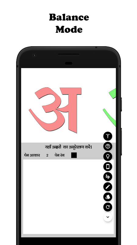 यह ऐप विशेष रूप से वर्णमाला के अनुरेखण के अभ्यास के लिए डिज़ाइन किया गया है। अधिक उपयोगकर्ता के अनुकूल बनाने के लिए हम हिंदी मेनू भी शामिल किया हैं ताकि हर माता पिता आसानी से वर्णमाला सीखने के लिए ऐप चला सकें। बेहतर उपयोगकर्ता अनुभव के लिए, एप्लिकेशन केवल ऊर्ध्वाधर अभिविन्यास में ही चलेगा। अपने एंड्रॉइड मोबाइल फोन और टैबलेट उपकरणों पर सुंदर दिखता है।