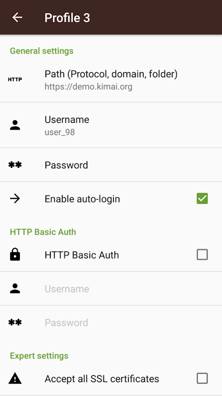 This app makes mobile tracking and logging into your kimai existing installation easier. You have to enter the URL, username, and password of your installation, if you want to be auto logged in after application start check the appropiate box.