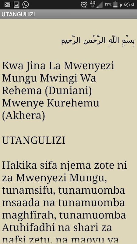 Hakika sifa njema zote ni za Mwenyezi Mungu, tunamsifu, tunamuomba msaada na tunamuomba maghfirah, tunamuomba Atuhifadhi na shari za nafsi zetu, na maovu ya matendo yetu. Anayemuongoza Mwenyezi Mungu hapana wa kumpoteza, na Anayempoteza, hapana wa wa kumuongoza. Nakiri kwamba, hapana apasaye kuabudiwa ila Mwenyezi Mungu, hali ya kuwa peke Yake, hana mshirika, na ninakiri kwamba Muhammad ni mja Wake na ni Mtume Wake. Mwenyezi Mungu Amrehemu na Awarehemu jamaa zake na Maswahaba zake na wanaowafuata hao kwa wema mpaka siku ya malipo na Amsalimishe kwa amani nyingi.