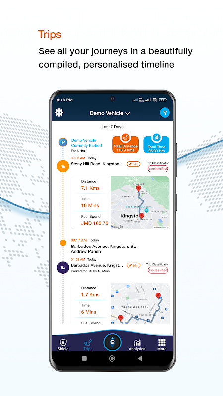 দূরত্ব, সময়, গতি ও জ্বালানি প্রতি ট্রিপ বন্ধ হবার পর অতিবাহিত এর ব্যাপক বিবরণ প্রতিটি ট্রিপ লগ ইন করুন। সাপ্তাহিক রিপোর্ট।
