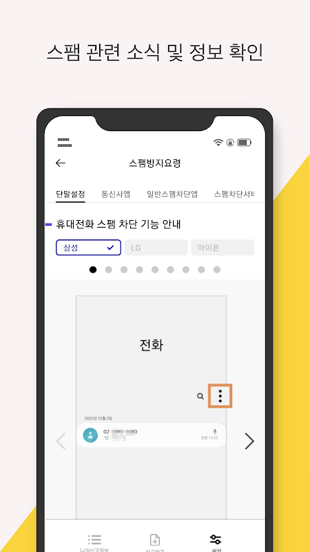 스마트폰으로 수신하는 전화 및 문자를 언제든 신고해 주세요. 신고된 스팸 건들은 조사 후 관련법령에 따라 처벌하고,