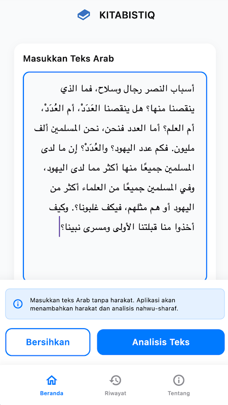এই অ্যাপ্লিকেশনটি আপনাকে হলুদ বই/গুন্ডুল বই, অথবা স্বরবর্ণ ছাড়া আরবি বই পড়তে সাহায্য করে। স্বরবর্ণ দিয়ে টেক্সট তৈরি করার পাশাপাশি, অ্যাপ্লিকেশনটি পড়ার নির্দেশাবলী (লিপ্যন্তর), অনুবাদ (পাঠ্য এবং প্রাসঙ্গিক), এবং সম্পূর্ণ শব্দ-দ্বারা-শব্দ সিনট্যাকটিক (নাহউ) এবং রূপগত (শরাফ) বিশ্লেষণও প্রদান করে।