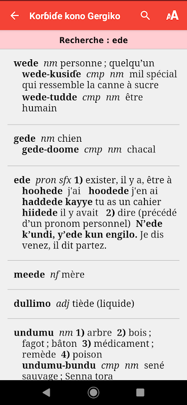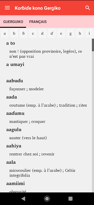 এই অ্যাপ্লিকেশন, "Korɓiɗe kono Gergiko" (ফরাসি ভাষায়, 'Treasure of the Guerguiko language') হল মধ্য চাদের গুয়েরগুইকো ভাষার একটি অভিধান এবং ভাষাগত গবেষণার টুল। এটি Guerguiko শব্দের একটি বর্ণানুক্রমিক তালিকা প্রদান করে। ব্যাকরণগত বিভাগ, ফরাসি সংজ্ঞা এবং চিত্রিত বাক্য সহ বিশদ বিবরণ পেতে শুধু একটি শব্দে ক্লিক করুন। একটি বর্ণানুক্রমিক সূচী, যেখানে ফরাসি সংজ্ঞা গুরগুইকো শব্দগুলিকে নির্দেশ করে, এছাড়াও প্রদান করা হয়। অ্যাপ্লিকেশনটিতে একটি শক্তিশালী অনুসন্ধান সরঞ্জাম রয়েছে। অনুসন্ধান আইকনে ক্লিক করুন, আপনি যে শব্দটি খুঁজে পেতে চান সেই শব্দ বা শব্দের অংশ ("সম্পূর্ণ শব্দ" বিকল্পটি আনচেক করতে ভুলবেন না)। অ্যাপ্লিকেশনটি পুরো ডাটাবেসে এই শব্দের সমস্ত ঘটনা প্রদর্শন করবে, তা এন্ট্রি, সংজ্ঞা এবং চিত্রিত বাক্যে, গুয়েরগুইকো বা ফরাসি ভাষায়।