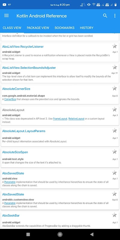 অ্যাপ্লিকেশনটিতে API স্তর 30 (অ্যান্ড্রয়েড 11.0) পর্যন্ত 7000+ (300+ প্যাকেজ) অ্যান্ড্রয়েড শ্রেণীর তথ্য রয়েছে।
