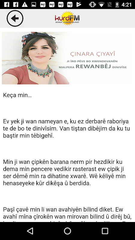 Bernameya nû ya Kurd FM ji bo pergala Android ê bi kar û kedeke hêja, bi ziravbihîstyarî û hurkolan hate amadekirin. Di bernameya nû ya KurdFM de hun dê gelek tiştên nû bibînin.