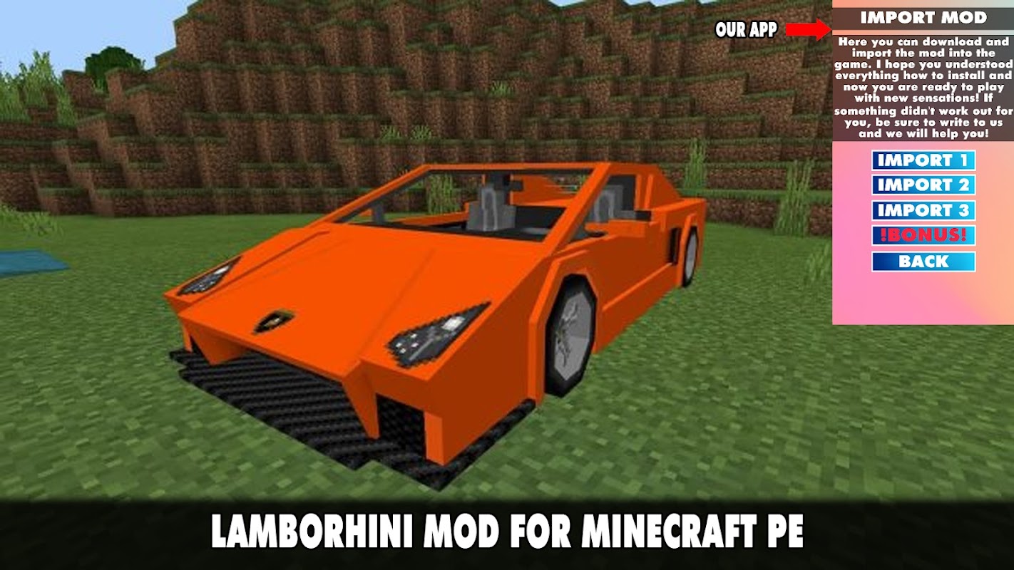 😀🤣If you are tired of the regular version of Minecraft and want to diversify the gameplay, you can install one of our modifications. This is what we talked about above. But this will not be an ordinary addition that adds fabulous animals, new locations or props, but a unique mods. You can download the always updated Lamborghini Mod for Minecraft Pocket Edition 2022!🤣😀
