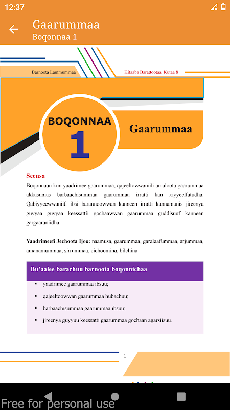 এই অ্যাপ্লিকেশানটি ইথিওপিয়ার শিক্ষাবিদদের সিভিক্স এবং এথিক্যাল এডুকেশন গ্রেড 8 স্টুডেন্টদের পাঠ্যপুস্তক, তথাকথিত আফান ওরোমু (লাম্মুম্মা)-এ অ্যাক্সেস প্রদান করে। পাঠ্যপুস্তকটি একটি সুবিধাজনক ই-বুক বিন্যাসে উপস্থাপিত হয়েছে, যা শিক্ষার্থীদের তাদের স্মার্টফোন বা ট্যাবলেটে সহজে অ্যাক্সেস করতে এবং ব্যবহার করতে সক্ষম করে।