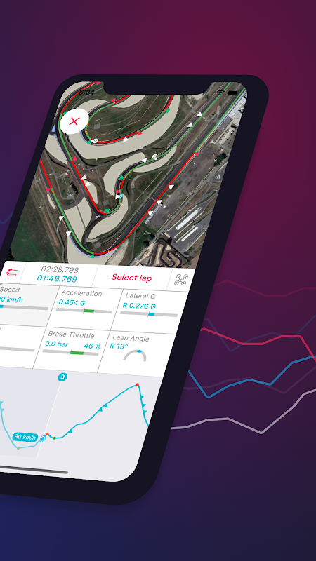 - লাইনগুলি কল্পনা করুন এবং ট্র্যাকের একটি নির্দিষ্ট অংশে আপনি কেন দ্রুত বা ধীর গতির ছিলেন তা দেখতে প্রতিটি ল্যাপ বিশ্লেষণ করুন। আপনি গতি, ত্বরণ বা হ্রাস, পার্শ্বীয় Gs, RPM, গিয়ার পরিবর্তন, থ্রোটল এবং ব্রেক প্রয়োগ, গো-কার্টের তাপমাত্রা এবং মোটরসাইকেলের জন্য লীন অ্যাঙ্গেলের পাশাপাশি মানচিত্রে আপনার লাইন বিশ্লেষণ করতে পারেন।