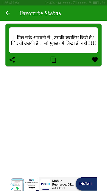आवेदन में सर्वोत्तम और नवीनतम शायरी, स्थिति और संदेश शामिल हैं।