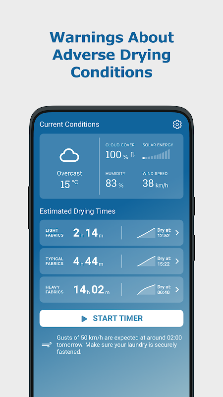 লন্ড্রি টাইমার হল একটি আবহাওয়ার অ্যাপ এবং টাইমার যা আপনার কাপড় বাইরে শুকানোর সময় আবহাওয়ার সর্বোচ্চ ব্যবহার করতে নিবেদিত। এটি স্থানীয় আবহাওয়ার অবস্থার উপর ভিত্তি করে আপনার লন্ড্রি শুকাতে কতক্ষণ সময় নেবে তা অনুমান করে এবং কখন আপনার কাপড় শুকানোর সেরা সময়/দিন হবে তা পরিকল্পনা করতে সহায়তা করে। এটি তাপমাত্রা, সৌর শক্তি, আর্দ্রতা, বাতাসের গতি এবং মেঘের আবরণ বিবেচনা করে।