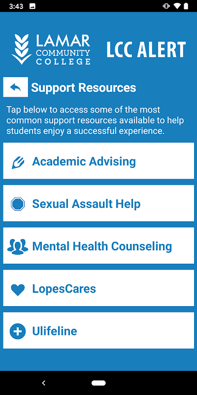 - সহায়তা সংস্থান: লামার কমিউনিটি কলেজে একটি সফল অভিজ্ঞতা উপভোগ করতে একটি সুবিধাজনক অ্যাপ্লিকেশনটিতে সহায়তা সংস্থান অ্যাক্সেস করুন।