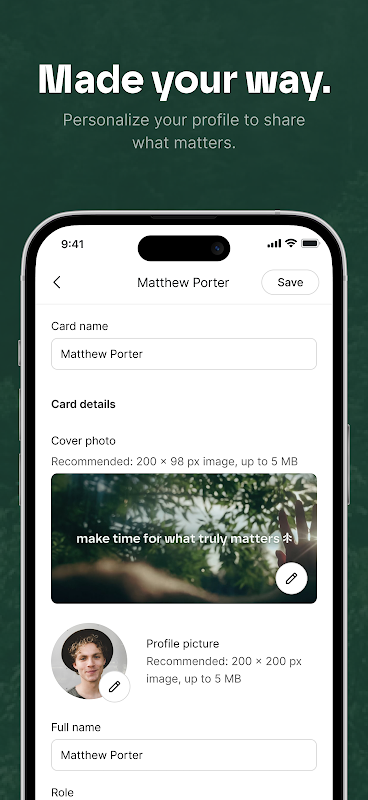 বিভিন্ন ভূমিকা বা ব্যবসার জন্য একাধিক কাস্টমাইজযোগ্য ডিজিটাল কার্ড তৈরি করুন। যেকোনো সময় আপনার নম্বর, ইমেল বা শিরোনাম আপডেট করুন — আপনার পরিচিতিরা তাৎক্ষণিকভাবে আপডেট হওয়া সংস্করণ দেখতে পাবে। আর কোন পুরানো বিবরণ, হারানো কার্ড, বা ম্যানুয়াল সম্পাদনা. পাতাহীন কার্ডগুলি আপনার পেশাদার পরিচয়কে গতিশীল এবং সিঙ্ক রাখে।