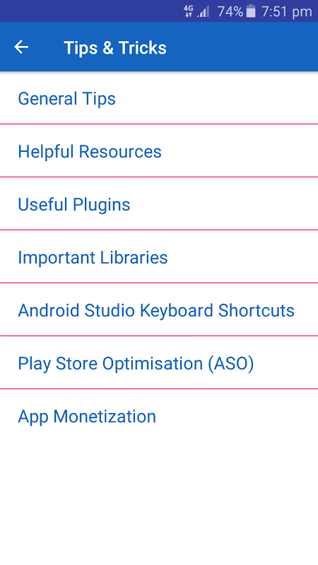 A Full Packed Android App Development Course 👍 with examples and explanations for you to take a step forward in your career. The App is designed in a way that even a layman who has no prior knowledge of Android but has some basic knowledge of Java can learn android app development and become a professional developer with advance level concepts and tutorials.