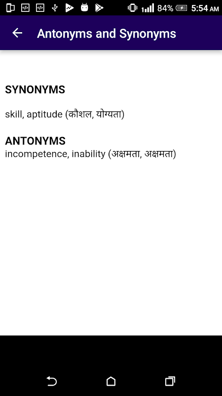 এই অ্যাপটিতে প্রতিশব্দ, বিপরীত শব্দ, একটি শব্দ প্রতিস্থাপন এবং একটি নির্দিষ্ট শব্দের হিন্দি অর্থ সহ গুরুত্বপূর্ণ শব্দ রয়েছে।